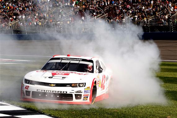 Larson, who had posted five second-place finishes in 37 previous NNS starts, grabbed the lead after a restart on Lap 135 of 150 and survived an intense battle against Kevin Harvick and Kyle Busch to win for the first time in the Nationwide Series, arriving at the finish line 0.342 seconds ahead of Harvick, who edged Busch for second by 0.04 seconds.